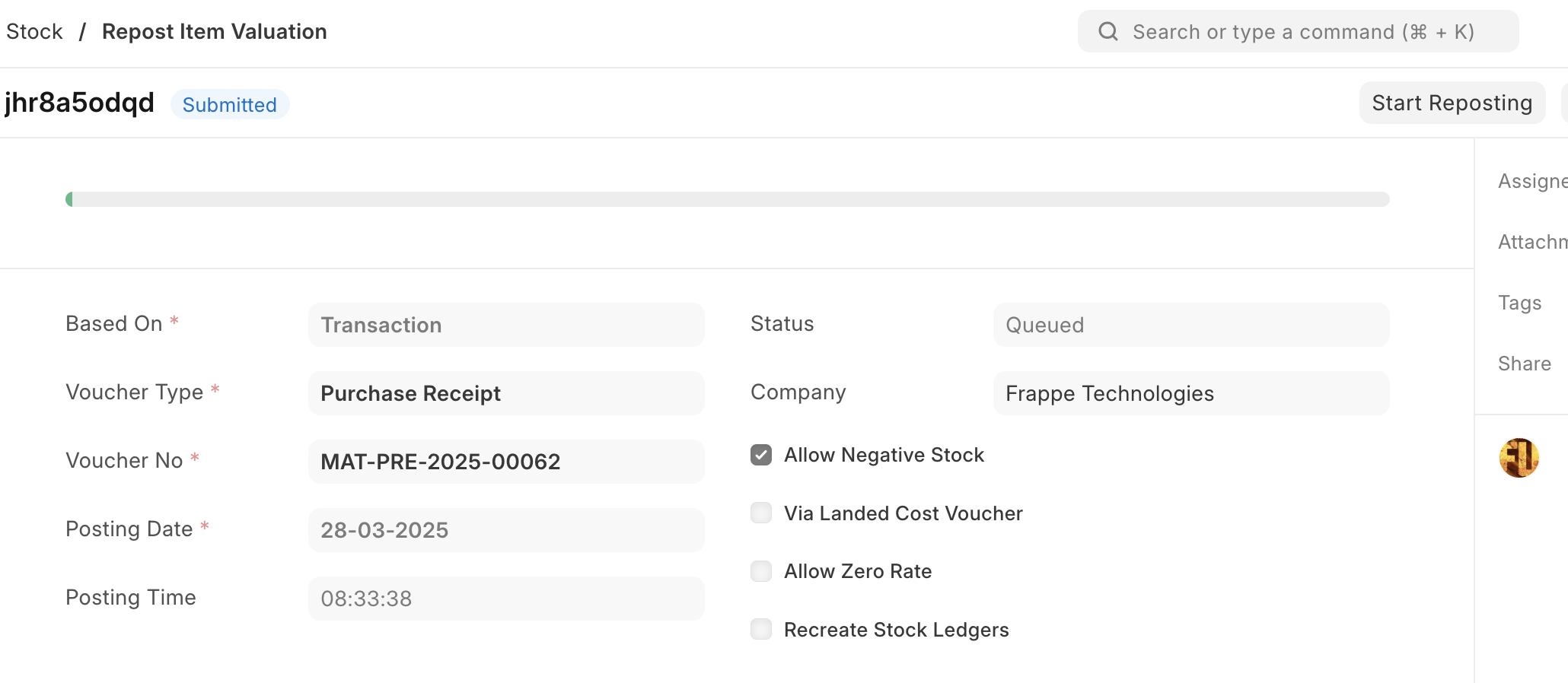 Si los registros de existencias tienen problemas que resultan en cálculos de valoración o cantidad de existencias incorrectos, se puede utilizar la función «Reenviar valoración de artículos» para solucionar esto.