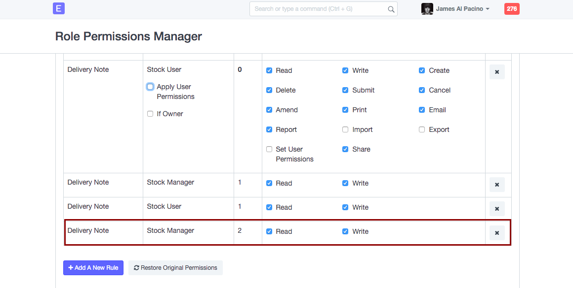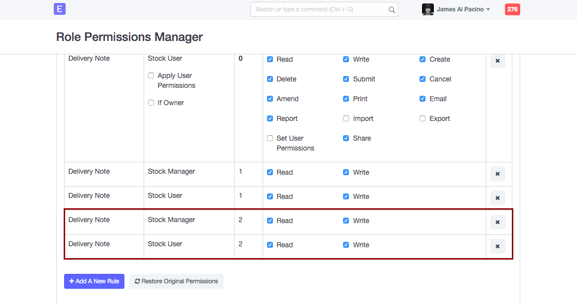 Para los administradores de stock, tendrán permiso en los campos de la nota de entrega con nivel de permiso 2, mientras que un usuario de stock no tendrá ningún permiso en el nivel de permiso 2 para la nota de entrega, porque su rol no ha sido asignado con una regla que le permita leer o escribir en un campo con nivel de permiso de 2, como se muestra a continuación.