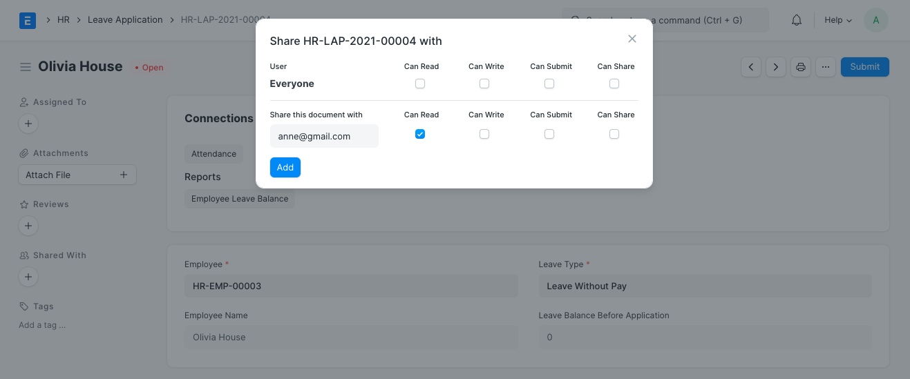 Además de los permisos de usuario y rol, también puede compartir un documento con otro usuario si tiene permisos para compartirlo. Tenga en cuenta que un documento compartido será visible para el otro usuario incluso si está restringido mediante Permisos de usuario .