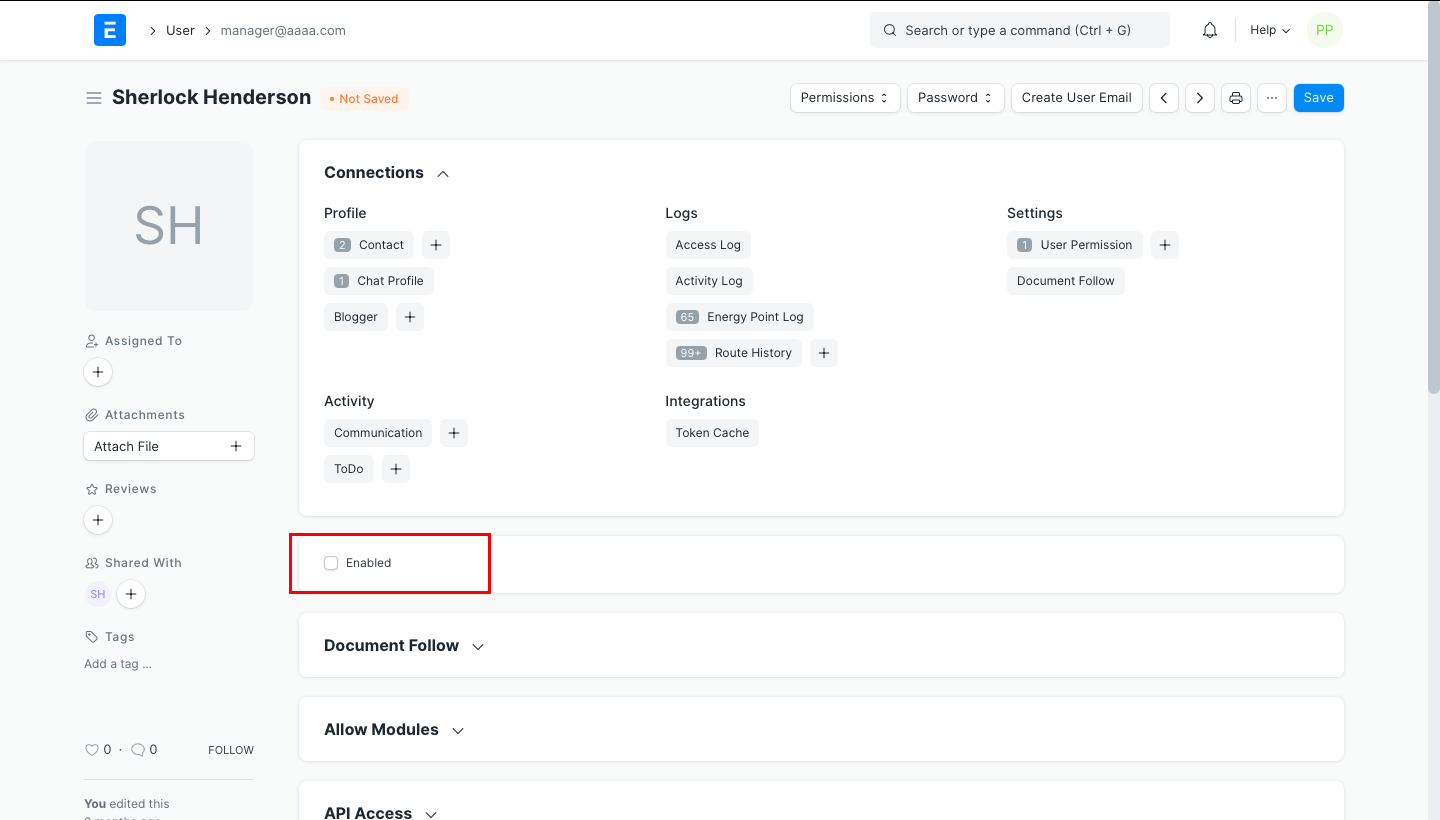 - Desmarque la casilla de verificación ‘Habilitado’ para el usuario seleccionado