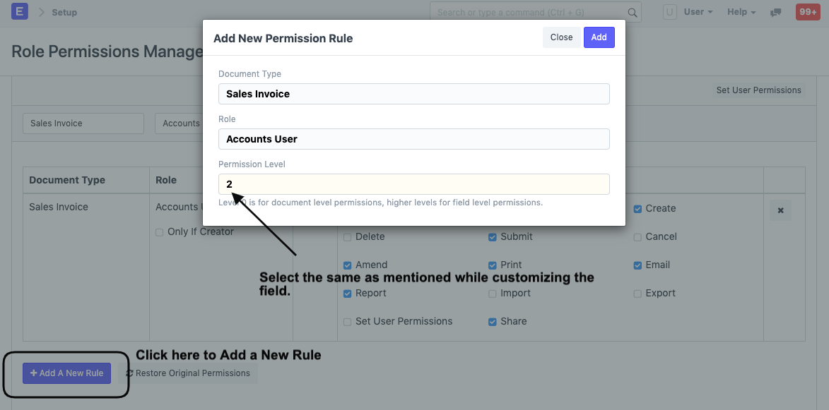 3. Una vez guardado, haga clic en Agregar una nueva regla en el Administrador de permisos de roles y seleccione el Tipo de documento y el Rol, en nuestro caso, _Cuentas_ _Usuario_, configure el Nivel de permiso como 2 y otorgue al Empleado acceso de lectura.