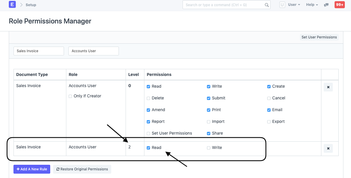 Así es como el Administrador de permisos de roles mostrará la regla recién creada con el nivel de permiso como 2: