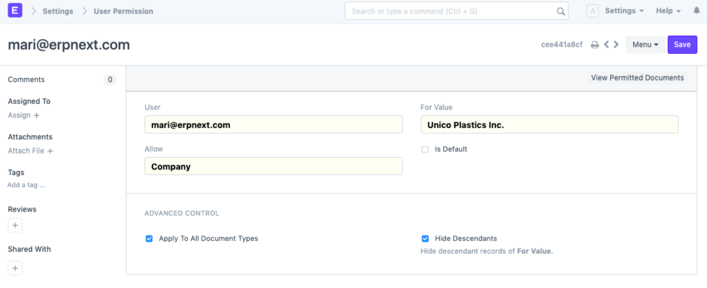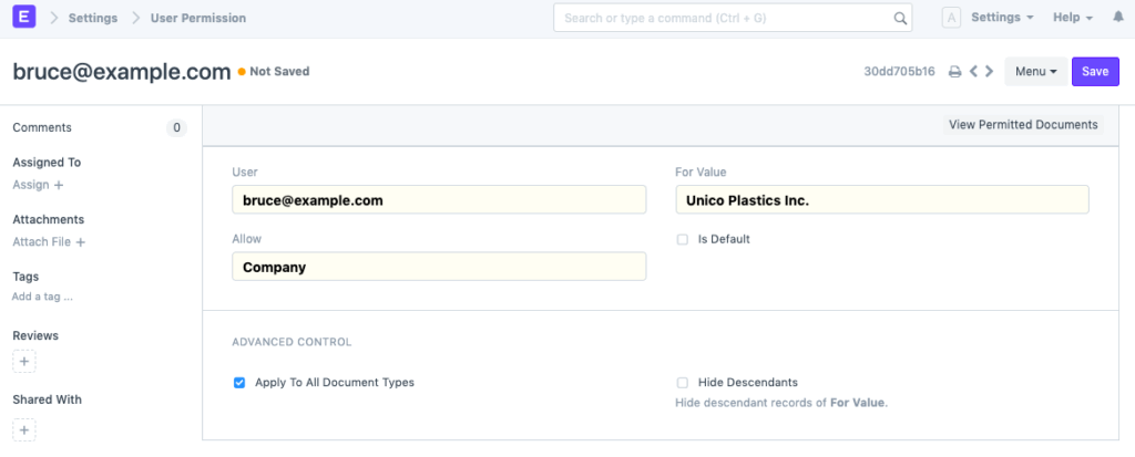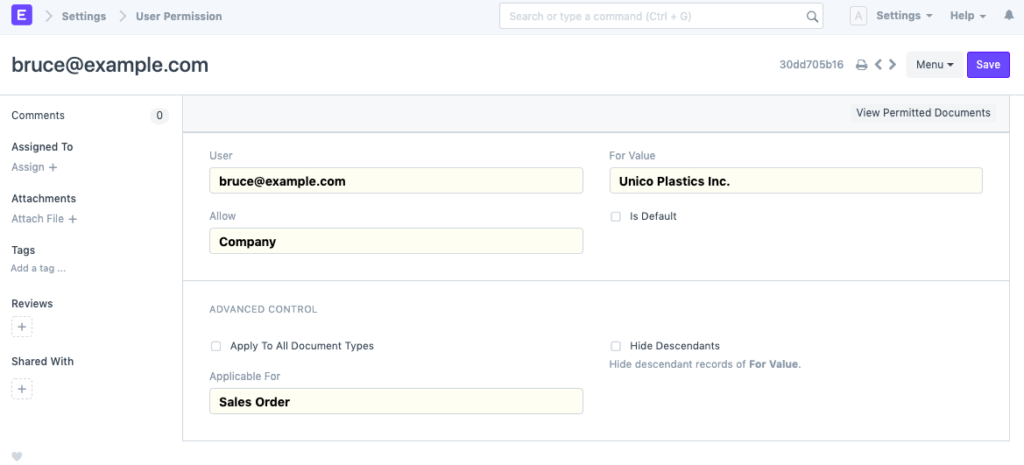 Los permisos de usuario permiten restringir el acceso a documentos seleccionados según los campos de enlace del documento. Por ejemplo, supongamos que trabaja con varios territorios y desea restringir el acceso de ciertos usuarios de ventas a las cotizaciones/órdenes de venta de un territorio específico. Esto se puede hacer mediante los permisos de usuario. Las restricciones se pueden establecer para clientes, proveedores, grupos de clientes, grupos de proveedores, etc.