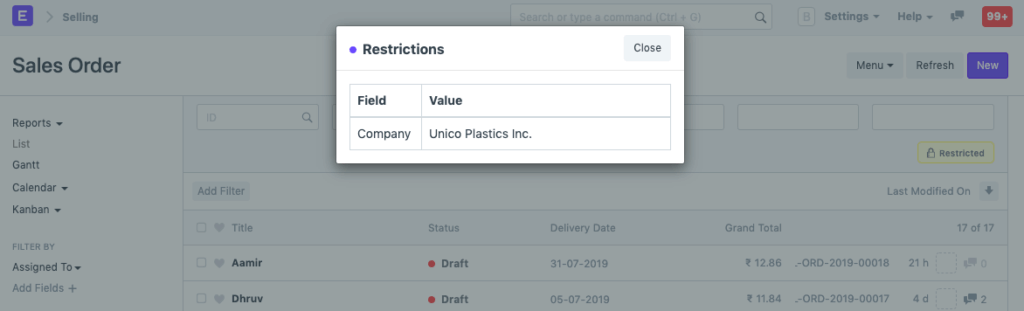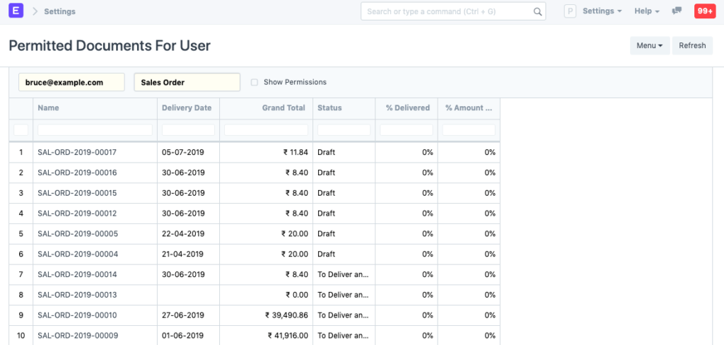 Los permisos basados en roles permiten configurar el acceso completo (de manera predeterminada) a un tipo de documento (doctype) como Factura de venta, Pedidos, Cotización, etc. Esto significa que cuando asigna un rol de Usuario de ventas a un usuario, este puede acceder a todos los Pedidos de venta y Cotizaciones.