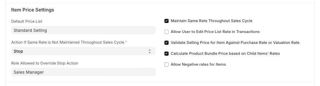 Si necesita que el precio del artículo obtenido de la Lista de precios de un artículo sea editable, debe desmarcar este campo.