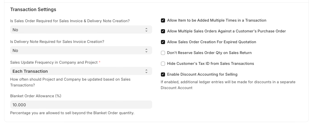 Esta es una comprobación de validación que evita que un artículo se agregue varias veces en la misma transacción si no está marcada. En algunos casos, esto podría ser una necesidad explícita; si es así, marque esta casilla.